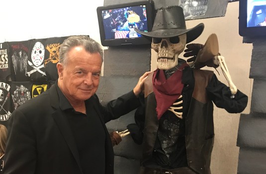 But the smile from Hollywood we were most excited to meet was the amazingly talented Ray Wise who we parody as the owner of the Howl-Inn Grub & Spirits. We luckily caught him between waves of fans to shake his hand with high praise for his work, and mentioned Screaming Soup! and his animated double. He was tickled by the idea we had animated him which gave us enough courage to humbly ask if he’d mind havin’ his picture taken with the Deadwest prop. He was kind ‘nough to oblige and you can see the result below! Thank ya kindly, Ray. We’ll get ya that link to the episode like ya asked soon!