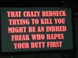 Anyway, it came time for the show to start, Darcy and Sir Purr said “Here’s Joe Bob!” and we kicked our boots up to an impressive 2.5 hour speech on how rednecks saved Hollywood’s ass with uncensored Joe Bob commentary supported by tons of pictures, trailers, and clips. Now, we feel like it’s a losin’ battle when we want to share a single thought with folks sometimes, so it’s damn impressive to watch anyone hold a crowd’s attention for nearly three hours and still have ‘nough gas in the tank for ‘nother meet and greet afterward. Wow!