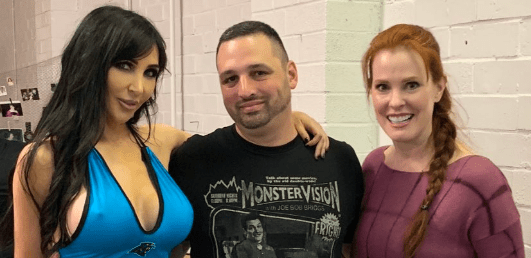 ‘nother shockin’ bonus was Joe Bob’s surprise guest from Alaska, MonsterVision’s most popular mail girl, Rusty! Jumpin’ jack-o-lanterns! That was quite the photo opportunity for fans, ’cause Joe Bob said this was the first time two of his mail girls had ever been in the same place at the same time. It was even funnier when our favorite ghost girlfriend Mandy told us later Rusty was darin’ her to peek in the little boos room for fun.