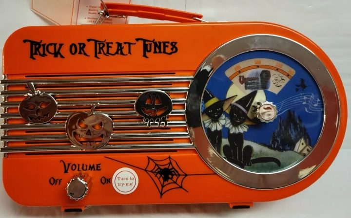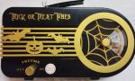 The last item that pulled us in like a tractor beam and had us runnin’ to the registers with it in a death grip were these Mr. Halloween Trick or Treat Tunes radios. Sleek retro designs with some pretty bad ass decals, these babies tune into three modestly pre-recorded channels fer weather, sports, and organ jams. We found ’em in a Marshalls department store, but plenty are sold online for reasonable prices.