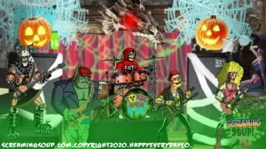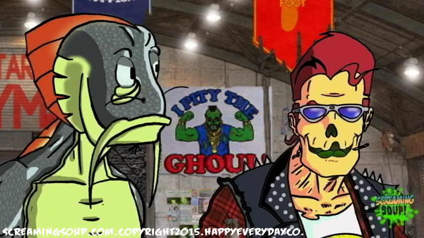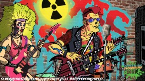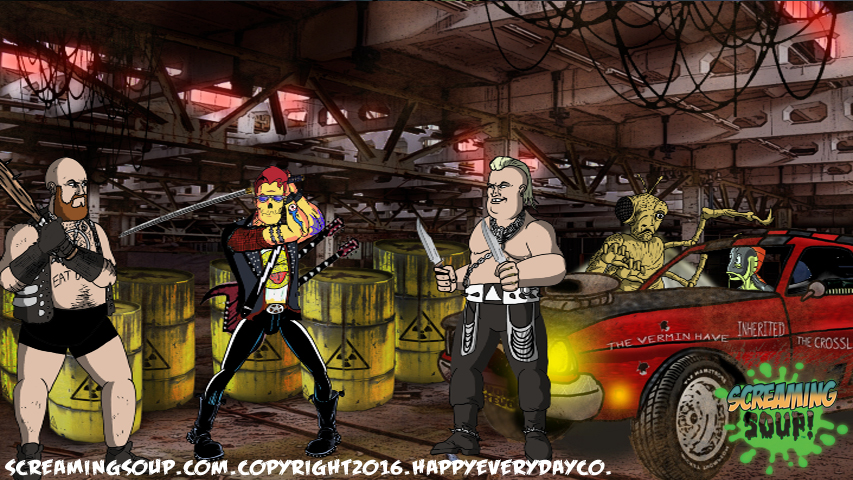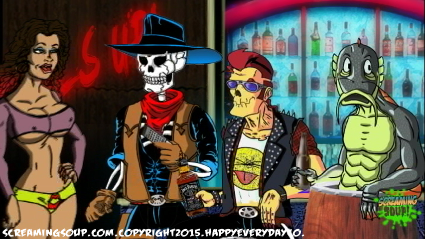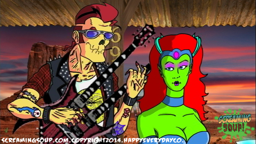 Deadbeat is an egotistical punk mutant zombie rocker who is the lead guitarist and singer for the Crosslands band Toxic Spew. A travelling performer with regular gigs at the Howl-Inn Grub and Spirits, Deadbeat can usually be heard talking about his long and skeptical music career he claims is interwoven with several famous musicians. Despite obvious exaggerated facts in most of his rock and roll tales that include prison stints and shark surfing competitions, most find Deadbeat tolerable and entertaining to say the least. He is unofficially seeing the Howl-Inn’s alien waitress Aleena, who he has a hard time committing to because he wants to keep up his reputation as an unattached rocker star. His favorite instrument is his double neck Gibson guitar with 2 katana swords hidden in it.