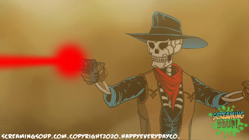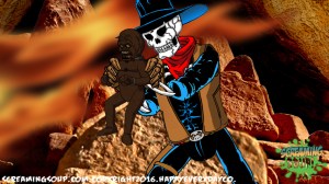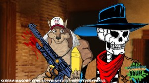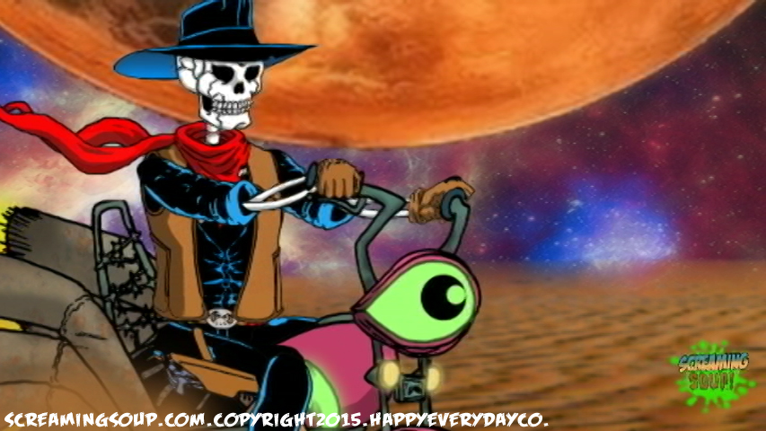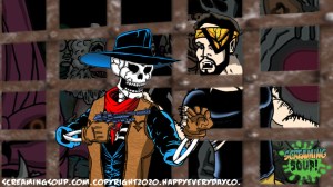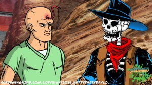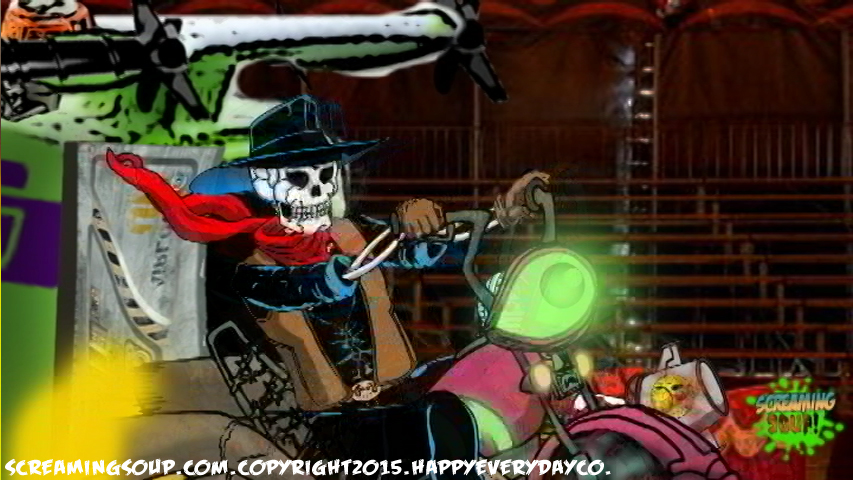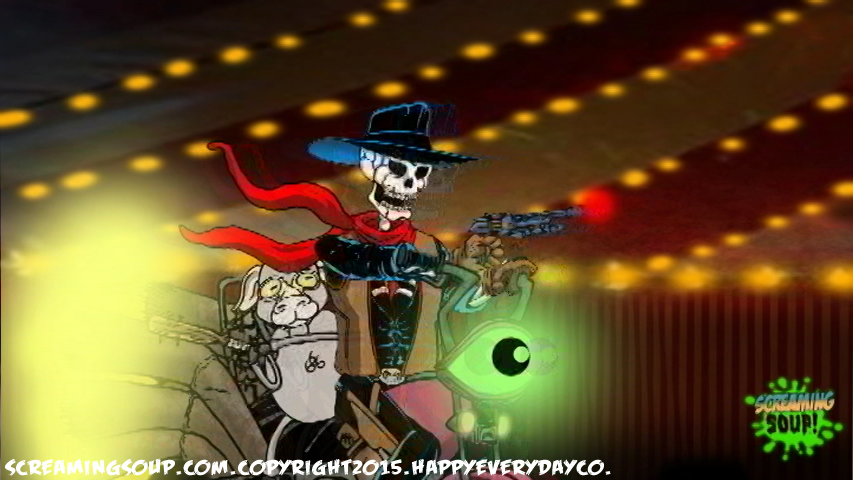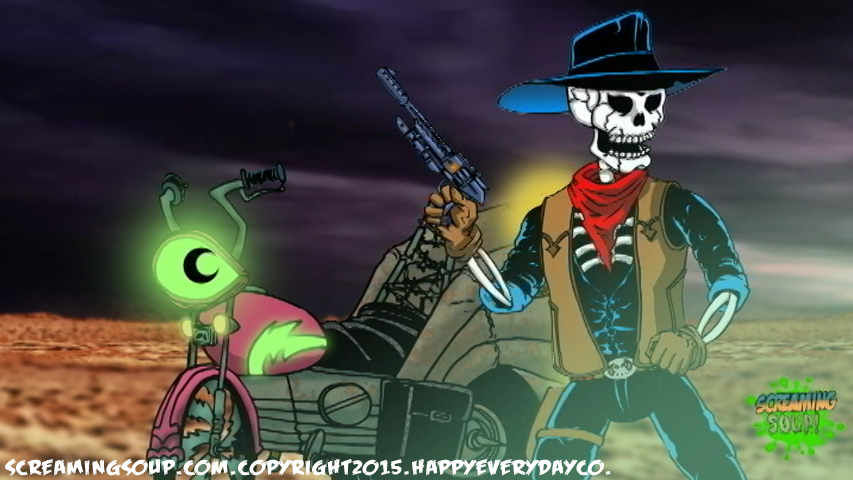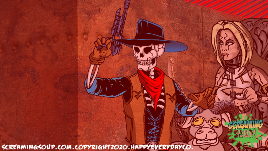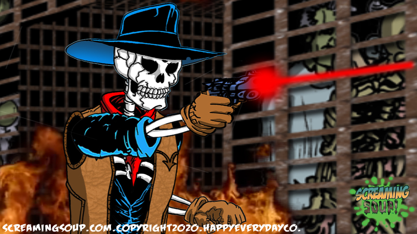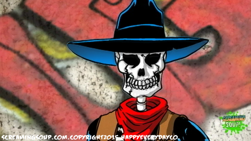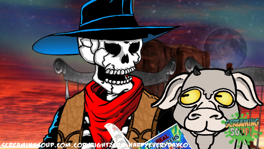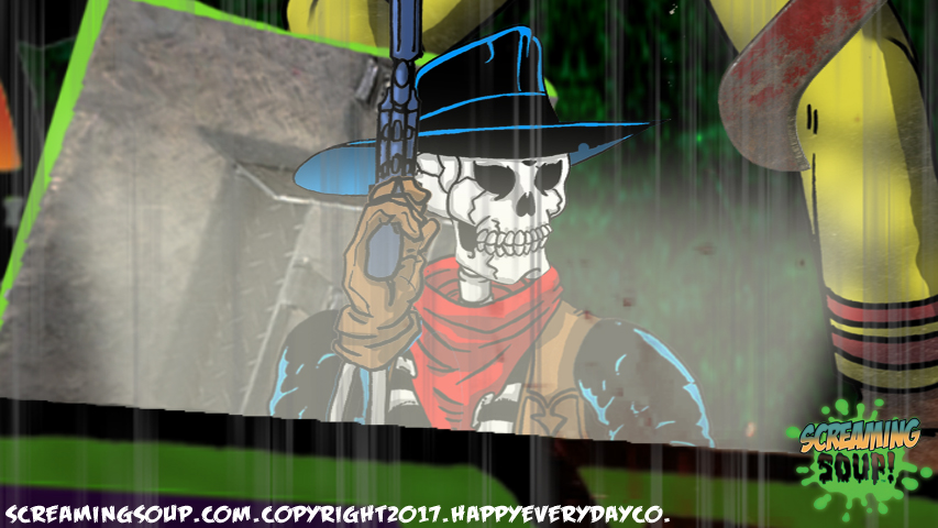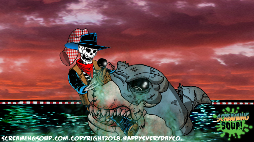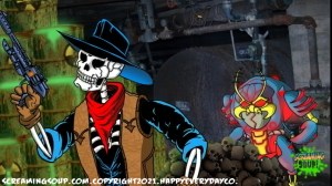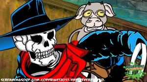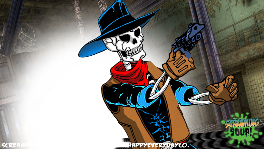 Fighting for infamy and riches when he was alive, Deadwest’s outlaw lifestyle was cut short in a hail of gunfire. Thanks to radioactive tractor beams from bovine thieving U.F.Os, Deadwest was resurrected from his ditch grave and continues his quest for infamy and fortune while wandering the interdimensional Crosslands.