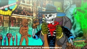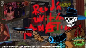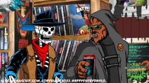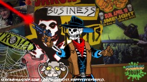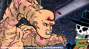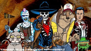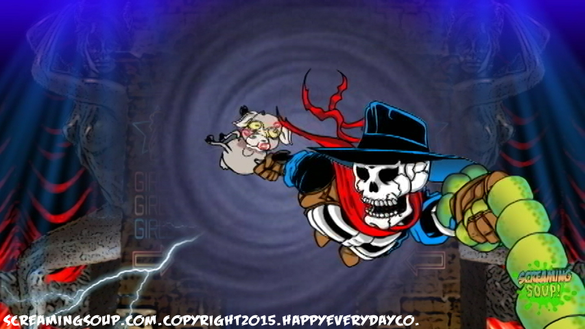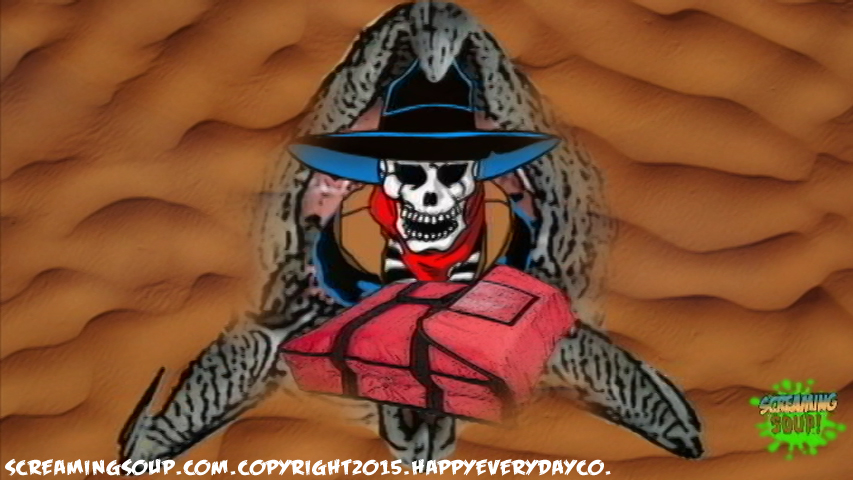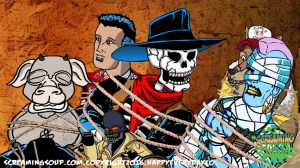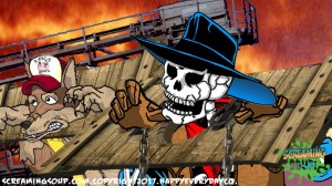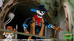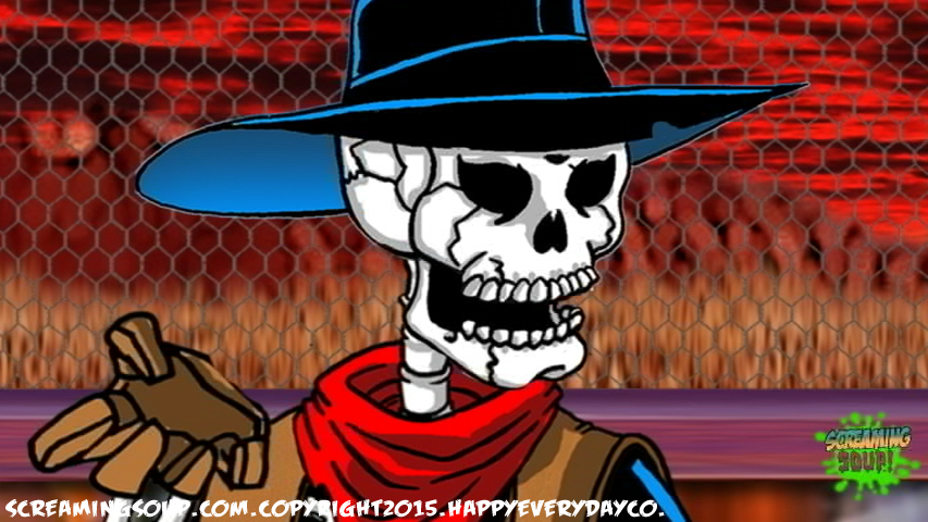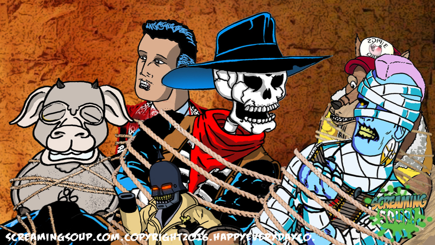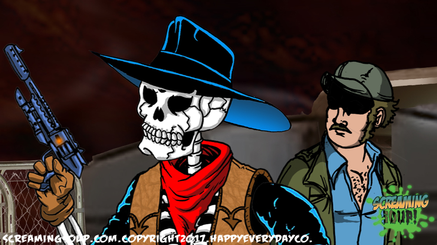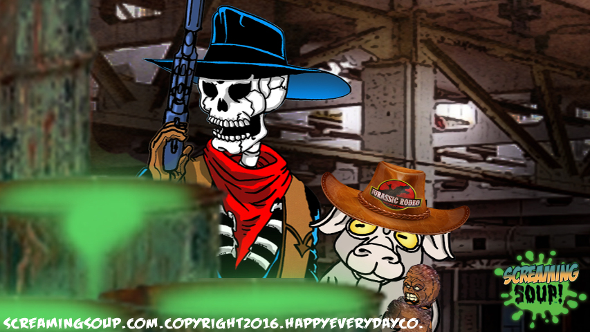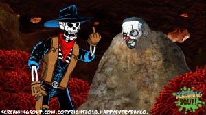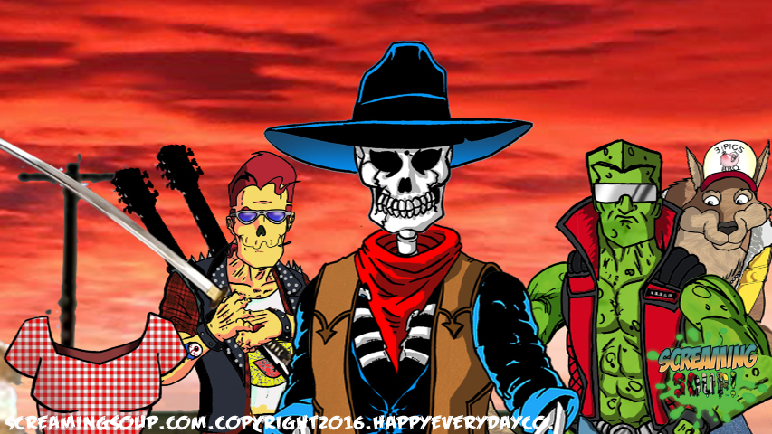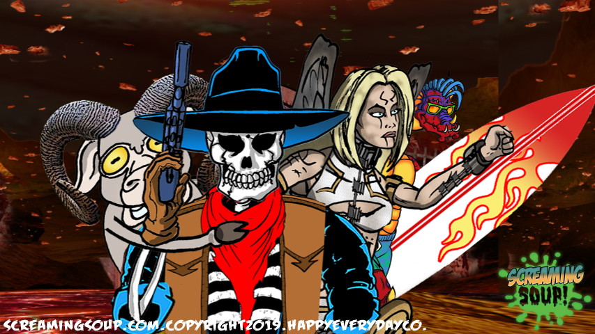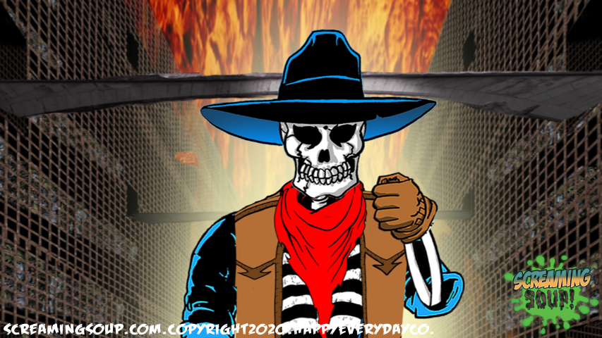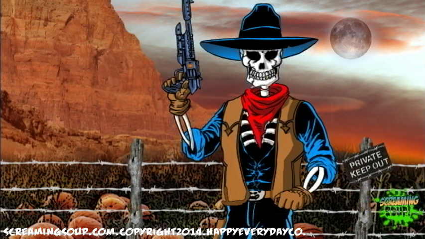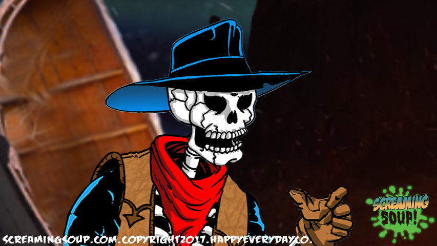 Fighting for infamy and riches when he was alive, Deadwest’s outlaw lifestyle was cut short in a hail of gunfire. Thanks to radioactive tractor beams from bovine thieving U.F.Os, Deadwest was resurrected from his ditch grave and continues his quest for infamy and fortune while wandering the interdimensional Crosslands.