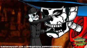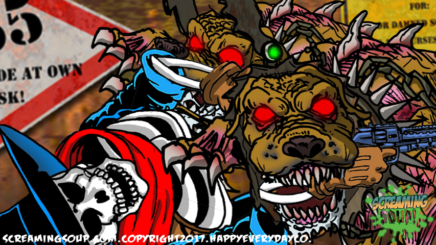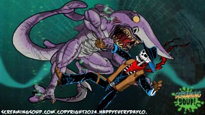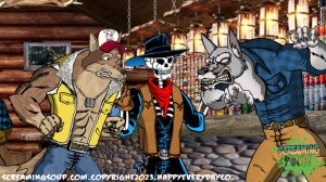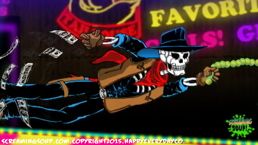 Deadwest’s weapon of choice is a laser pistol he stole from the same aliens who accidentally resurrected him. He’s quick to draw any moment someone annoys him, firing an onslaught of red hot lasers. His second favorite weapon is his sawed off double barrel shotgun, Kingdom Come, with notches carved into the handle for each kill. Living in his rib cage is Tequila Worm, an intoxicated fiesta loving worm who Deadwest can’t seem to get rid of. In tight spots, Deadwest extracts Tequila Worm from his ribs to use as a living lasso. When not at the Howl-Inn, Deadwest can often be seen cruising the Crosslands on his living motorcycle, Road Rash.