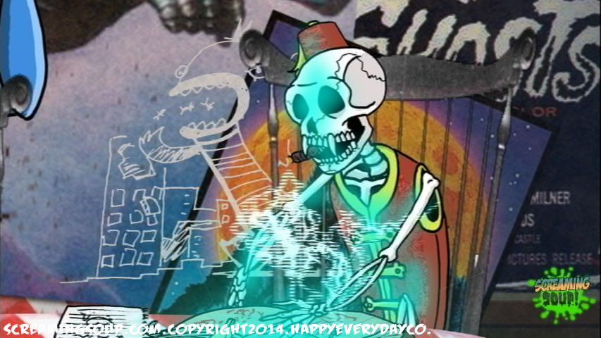 After Deadwest banished Buzzkill within the pages of a magical tome called Deadlit, Funnybone managed to subdue Dedlit, translate its pages into a second hand copy called the Ded Subject Notebook, and helped Buzzkill escape its pages. Infused with new powers he absorbed from Dedlit, Buzzkill challenged Deadwest to a horror host off with the loser agreeing to leave the Howl-Inn Grub & Spirits forever, and the winner getting the other’s sidekick. With Heck Machine as the ref, Deadwest was named the winner and became Funnybone’s new master.
