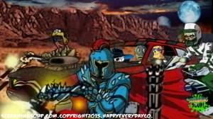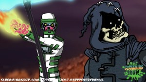 After being drawn to the chaos created by a nuclear explosion near the Howl-Inn Grub & Spirits, the Iron Horsemen of Doom found Billy on the outskirts of the disaster and pursued him until finally dragging him back to the underworld to fulfill the old ones’ prophecy. Moments away from releasing their masters, the unholy ritual was ruined at the last possible second by Deadwest and his gang who escaped with Billy back to the Crosslands. The Iron Horsemen of Doom returned topside to complete Billy’s sacrifice, but it was discovered Billy’s one weakness, a specially made dagger, could also be used to vanquish the heralds. Deadwest and Billy killed Pestilence along with War and Famine and secretly scattered the fallen heralds’ helmets to the far corners of the Crosslands for safe keeping. Death manages to escape back to the underworld where he continues to plot his fellow riders’ resurrection and Billy’s ultimate sacrifice.