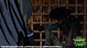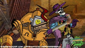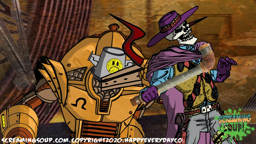 Teamed with Heck Machine, Psychowest did eventually find Deadwest in the ass end of hell but failed to stop him from interrupting the ritual. While being ushered back to his cell, he used his wits to instigate a riot among hell’s inmates and escaped in time to ambush Deadwest at an abandoned bullet train station. The battle ended in a draw with the arrival of Heck Machine, after which Psychowest managed to stow away on the bullet train Deadwest used to rocket to freedom topside.