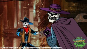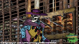 The Iron Horsemen of Doom (leaders of hell’s most powerful factions) were preparing to bust four elder gods from their heavenly cursed cages to resume their heinous dominion over the Crosslands but knew the unholy ritual was in jeopardy so long as Deadwest was running through the bowels of hell to stop it. Given their past, Psychowest was made an offer to find and destroy Deadwest in exchange for a free roaming afterlife. Jumping at the chance to be pardoned from hell and reignite his favorite rivalry, Psychowest was armed with as much ammo as he could carry from pistols to shotguns and grenades. His signature weapons, however, are a remote control coffin that transforms into a mini-gun on treads, and Boris, his pet spider in his skull whose web can be used for fighting enemies or getting out of tight jams.
