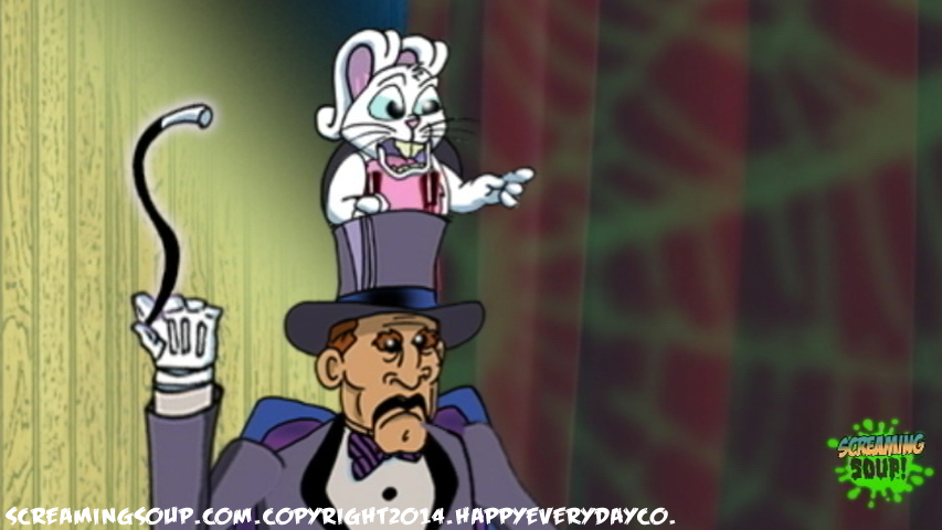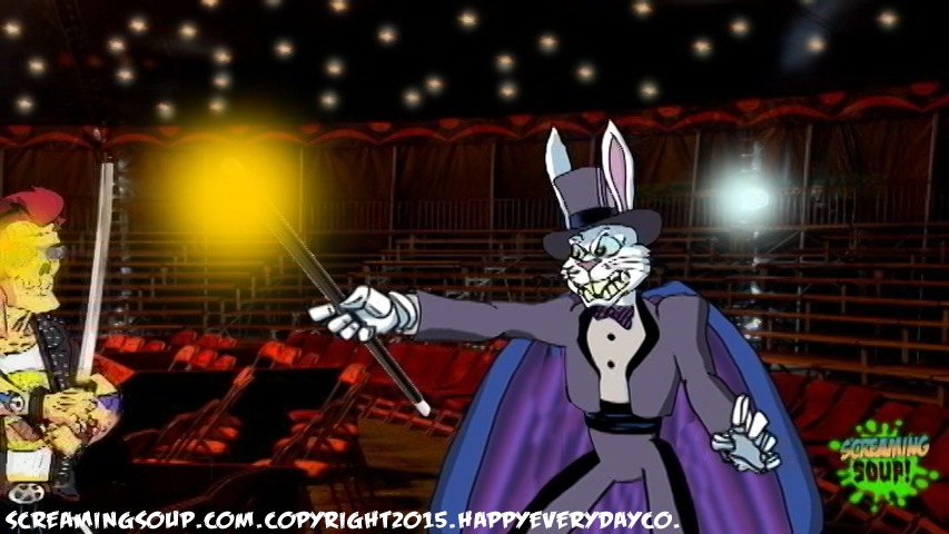 Rabbit Kadabra isn’t a one trick pony but three! Fed up with his magician’s lack of ambition for the bigger things in life, the furry foul mouth critter known as Rabbit stole his master’s living magic wand and fled to follow his own path for glory. Despite his natural talent for big magic numbers and jaw dropping show stoppers, Rabbit quickly found out nobody took a white rabbit seriously for a magician. Refusing to be denied his time in the limelight, Rabbit returned to his master only to transform him into a mechanical puppet with his own living wand. Controlling his master from within his top hat, Rabbit books shows as Rabbit Kadabra and struggles to become a celebrated big shot in the magic world. Rabbit tries to keep it a secret he’s a critter controlling a puppet, but he’s prone to pop out on stage screaming obscenities when angered by an unresponsive or heckling audience. The living wand acts as the straight man of the group who keeps Rabbit in check during such outbursts.