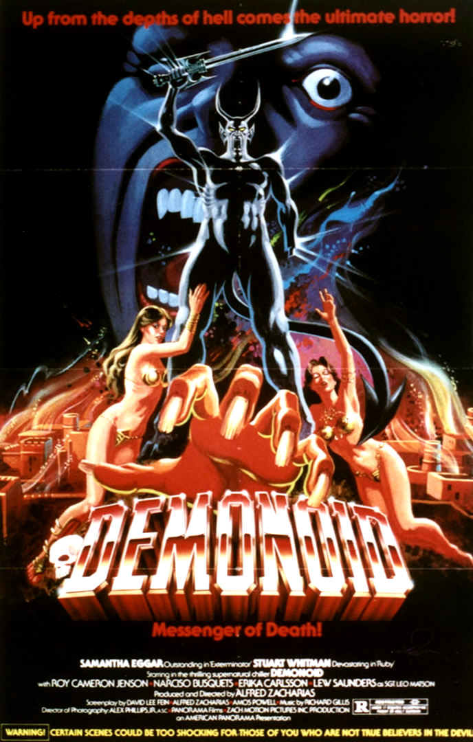 In this Evil Dead clone, a yahoo blindly leads a caravan of suckers to his grand mammy’s cabin to help him dig into his family’s satanic past but ends up endangerin’ ’em all when a dark force sicks a small army of deformed goo demons on ’em to complete a ritual for empowerin’ the Anti-Christ. This cheapo horror is charmingly cheesy fun with it’s non-stop supply of quirky victims comin’ outta the woodwork and decently executed effects from its mangled makeups to the wonderfully hand painted bolts of magic, but it falls short in the storytellin’ department with underdeveloped characters and repetitive standoffs. Biggest sour I gotta bash this flick for is introducin’ a hot shot magician but never havin’ him fight the demons with any of his parlor tricks. Monstrous transformations, topless bait, high kickin’ decapitations, impalin’, hand bitin’, satanic infections, suicidal grandpas, wrist slittin’, magically transportin’ fog, evil gas pumpers, demonic waitresses, bird shit, optical illusion cabins and barns, wall art demonoids with frog tongues, lame head crushin’, maulin’, witchy grandmas, goblin lookin’ transformations, demonic daggers that’re only good for one stab, spell books, babydoll transformations, stoic reactions, eye stabbin’, demonic psych-outs, can kickin’ magicians, monster on monster brawls, and magic symbol defenses! 3/5!