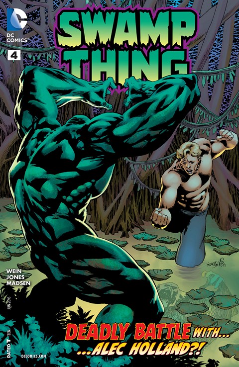 The first 2 issues must have been a warm-up, because artist Kelley Jones is cooking with fire now! Matt Cable returns with one of Swampy’s more hackneyed plots, offering the muckman the chance to turn human again with the help of guest superhero, Zatanna. Nearly zero action, but pages and pages of Kelley playing with shadows, Swampy’s vines, and Zatanna’s hair.