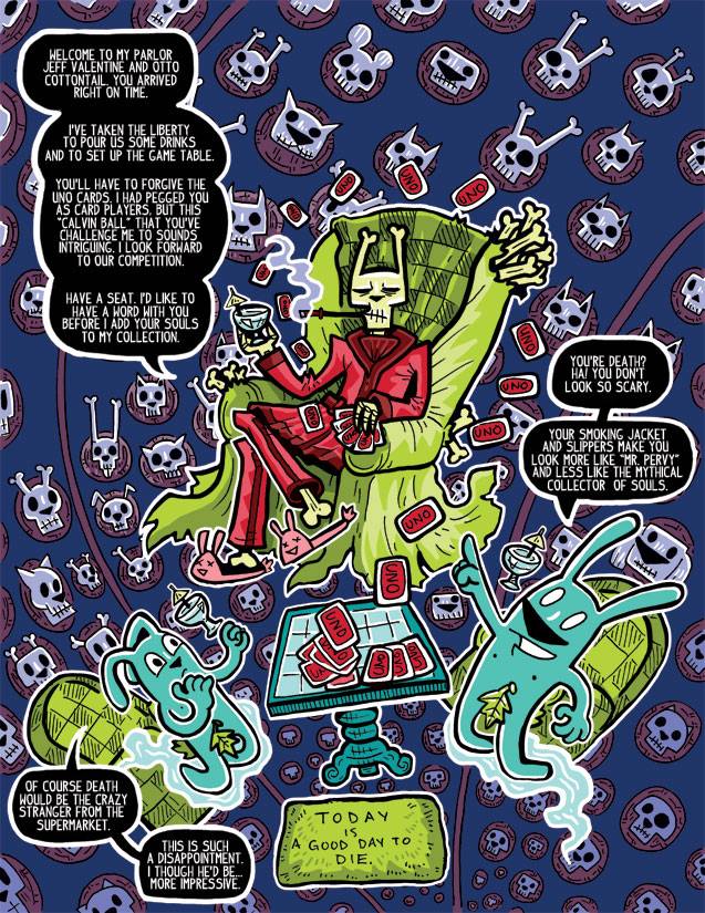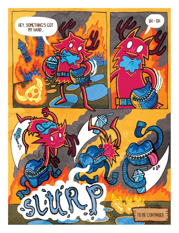 EM: I owe my current art style to watching one of my college professors work. His drawing style looked like a little kid’s drawing, and I thought to myself, “Why am I killing myself trying to draw realistically when others seem to enjoy making comics with a more cartoony style?” So, I watched a bunch of Cartoon Network shows (Chowder and Flap Jack) and they ended up influencing my current way of working. I also really like Dough Tenapell’s art and love Genndy Tartakovsky’s work.