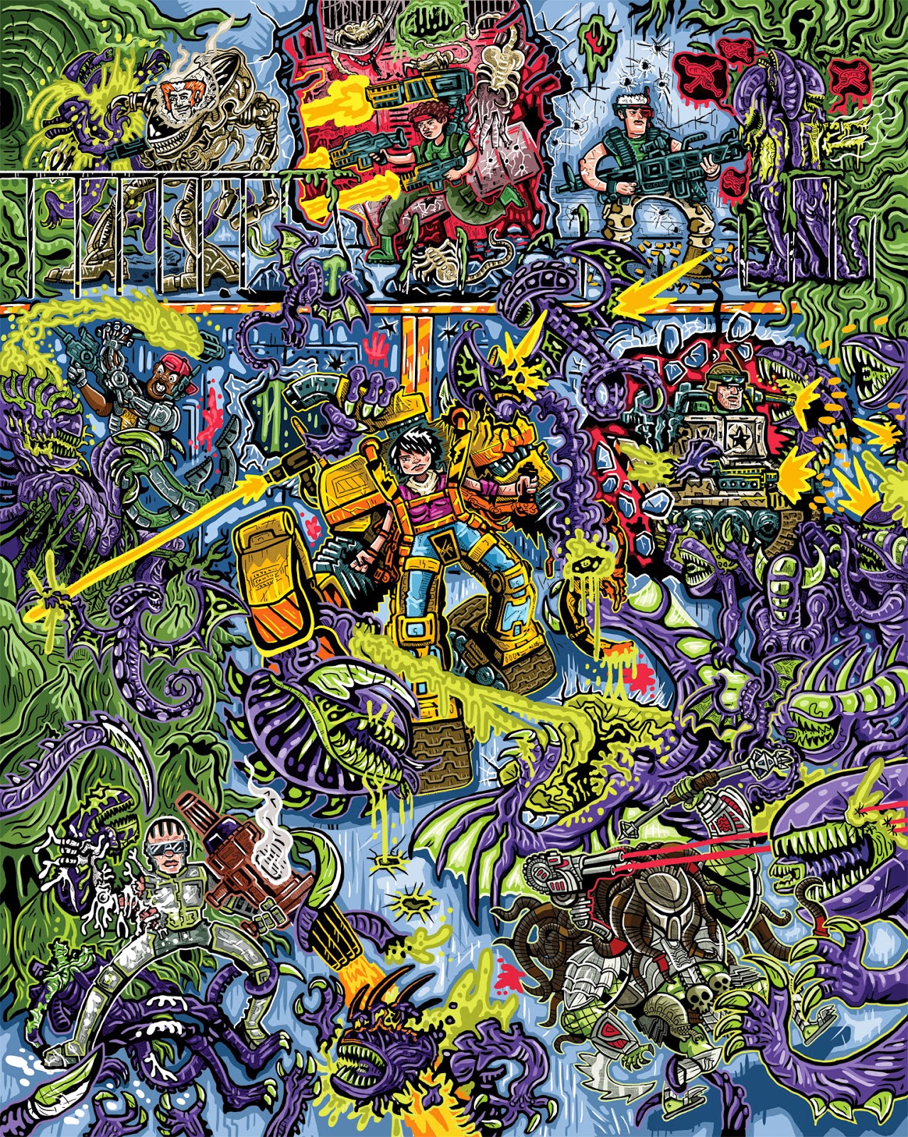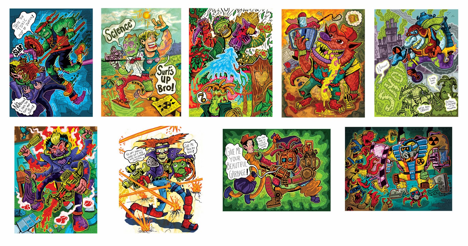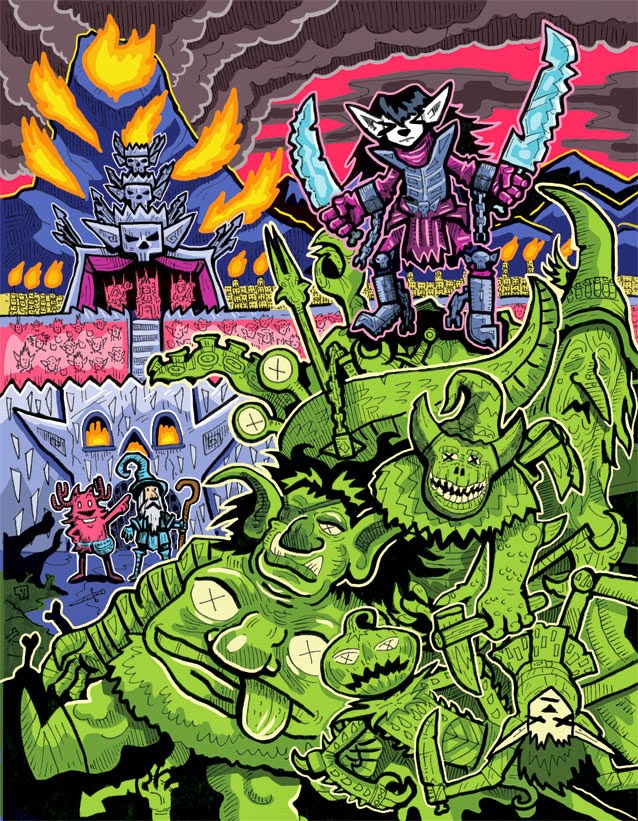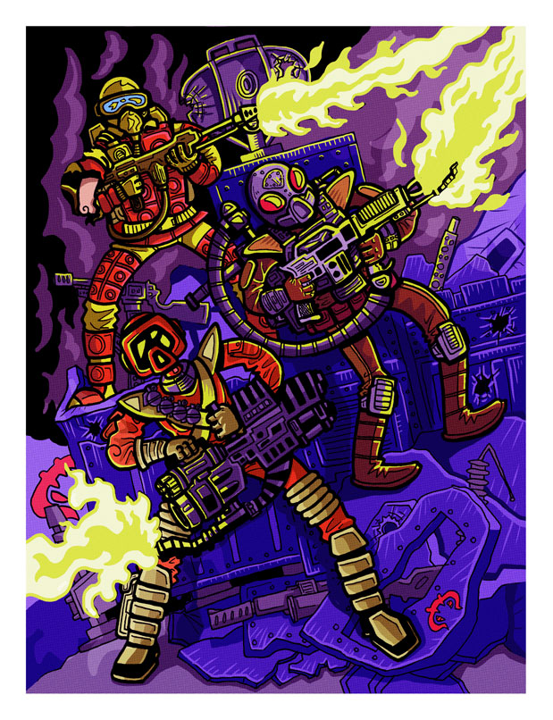 EM: Thanks! You know, for years, I was too freaked out to color my work, so all I ever did was black and white drawings. At one point, I decided to draw a bunch of my old action figures as a way to polish my artwork and psych myself up to working on our full length comic projects. I drew some early 90’s G.I. Joe and Ninja Turtles art and used the original toy lines’ vibrant color schemes for reference. I fell in love with those color combinations and now use them in all of our comics and posters.