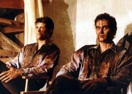 TS: After Scotty axes Shelly, there is a shot of her body parts on the floor twitching, and it was a nightmare to rig. Sam and the guys opened up the floor boards, and *Fake Shemps had to lie there all day while the boards were replaced and the gore applied. I like to think there may have been a less painful way to do that shot. (*Fake Shemp is a Sam Raimi term used for an actor standing in for another actor.)