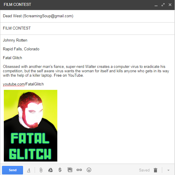Three winnin’ filmmakers will be contacted via email after 8/20/18, and their films will be reviewed in Screaming Soup!’s 50th episode in no particular order. In addition, Screaming Soup! will give each of the three winnin’ films at least one social media plug to raise awareness for them.