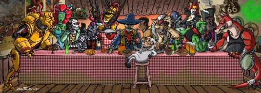 In other news, we haven’t heard a peep from the El Rey Network yet ‘bout our video submission to be featured in one of their animation showcases. Fangs crossed though, ‘cause we can see on our YouTube channel they haven’t watched the vid yet which means there’s still a chance we could be nationally broadcast right out of Robert Rodriguez’s ranch sometime in the near future. We’ve also been busy hittin’ Full Moon Empire up for more work on their new in-house comic, Dollman Kills the Full Moon Universe. Yup, we closed the deal on havin’ artwork in the first issue, and currently meetin’ some fast deadlines for squeezin’ more work into the second issue while gunnin’ to be one of the variant covers for issue three! This historic series is due to hit stands in comic shops ‘cross the country beginnin’ in August, so keep an eye out! As far as our own aspirations for a prequel comic to Screaming Soup!, we decided to expand it to a four issue limited series since most graphic novels are made of four or more comics. More work of course, but this is somethin’ we’re compelled to check off our bucket list.