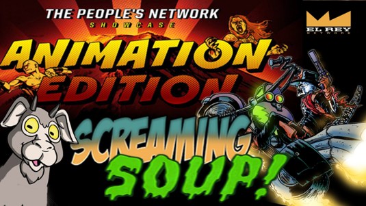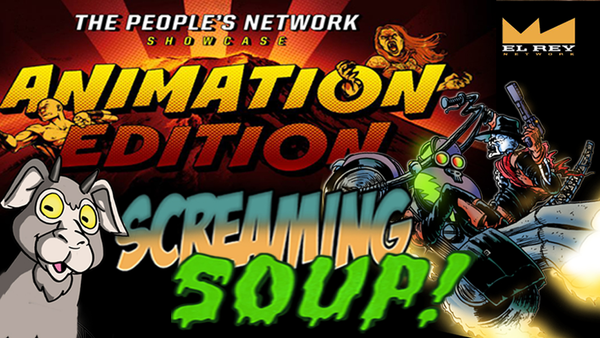 First off, we cut together pieces of past Screaming Soup! episodes to produce an adventure we could submit to the El Rey Network, better known as Robert Rodriquez’s cable channel. See, every so often El Rey features somethin’ called the People’s Network Showcase which broadcasts a handful of submitted works by filmmakers and artists on the rise. The point is to help get these creative folks exposure so fans and talent hungry companies alike can discover them and hopefully boost their career one way or another. Along with horror, suspense, and action showcases, the People’s Network also has an animated category which promotes all kinds of animators from stop-motion and CGI to 2D animation and still pictures . After watchin’ the latest animation showcase and seein’ El Rey’s lookin’ to round up enough content for a third round at their site right now, we couldn’t pass up another opportunity and made the time to enter our show. If it gets picked, we’ll tell ya right now, there’s no review. It’s strictly an animated adventure with your favorite gang from the Howl-Inn Grub & Spirits, ’cause we don’t wanna be disqualified for too long a runnin’ time or for includin’ copyrighted content they may be uncomfortable broadcastin’ despite the fair use laws. This was submitted a short time ago, so fangs crossed we’ll get some national exposure soon!